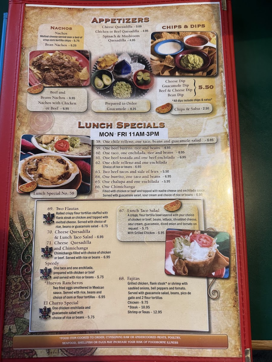 Welcome to El Charro Mexican Restaurant, a delightful spot nestled in Newnan, GA. The menu here showcases authentic Mexican cuisine, filled with vibrant flavors and comforting eats. Whether you crave a hearty burrito rolled with seasoned meats and drizzled in savory sauces, or perfectly crisp chalupas topped with fresh guacamole, satisfying options await.
